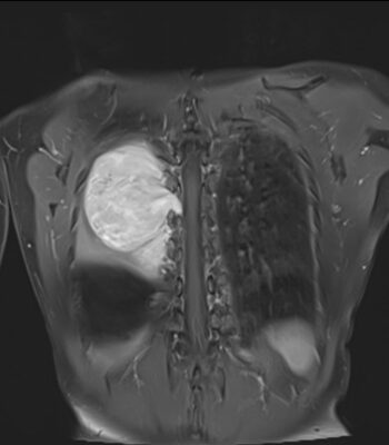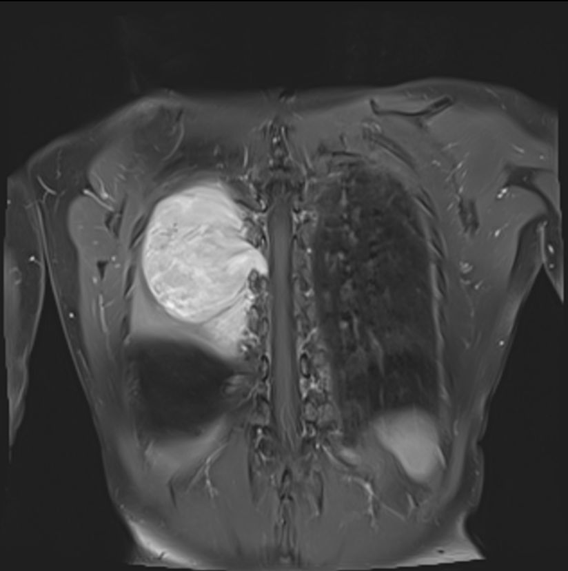 Masivní tumor odstupující z páteře v úrovni T7 – T8,